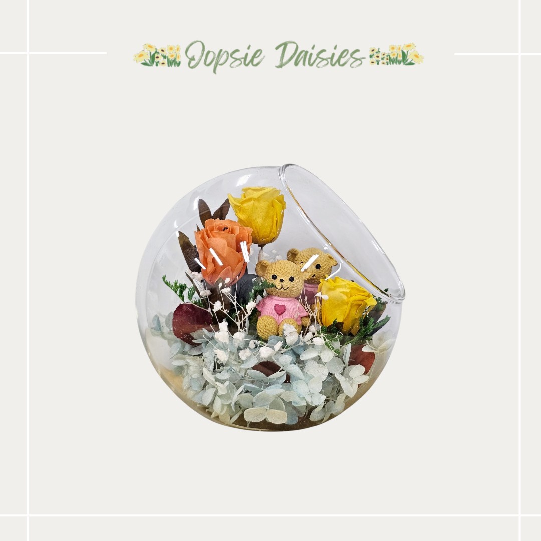 A miniature floral garden captured inside a stylish glass dome. Featuring preserved roses in cheerful yellow and peach tones, accented with soft dried foliage and a lovable teddy bear, this arrangement brings a sweet and cozy feeling to any space.