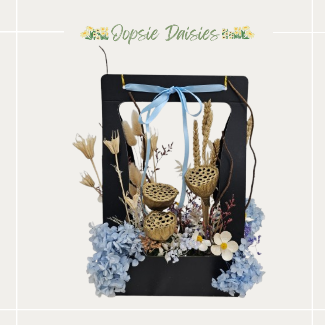 Nature Frame captures the beauty of preserved botanicals arranged within a modern, open-frame silhouette — a harmonious blend of earthy tones, golden textures, and soft blue florals that invite the calm of nature into any space.